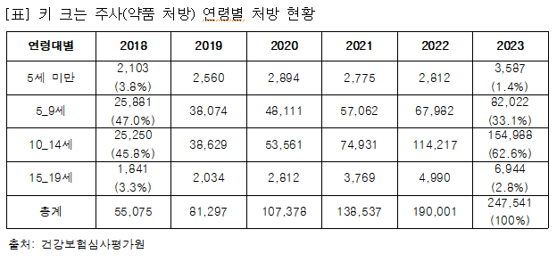 식약처가 국회에 제출한 성장 호르몬 주사 치료제 처방 현황을 살펴보면, 2022년 19만 1건에서 2023년 24만7541건으로 증가했으며, 2024년 6월 기준 12만4997건이다.