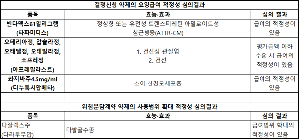 또 다른 결정신청 약제인 빈다맥스도 약평위를 통과했다. 빈다맥스의 적응증은 '정상형 또는 유전성 트랜스티레틴 아밀로이드성 심근병증(ATTR-CM)'으로, 지난해 11월 국가관리 희귀질환으로 지정됐다.