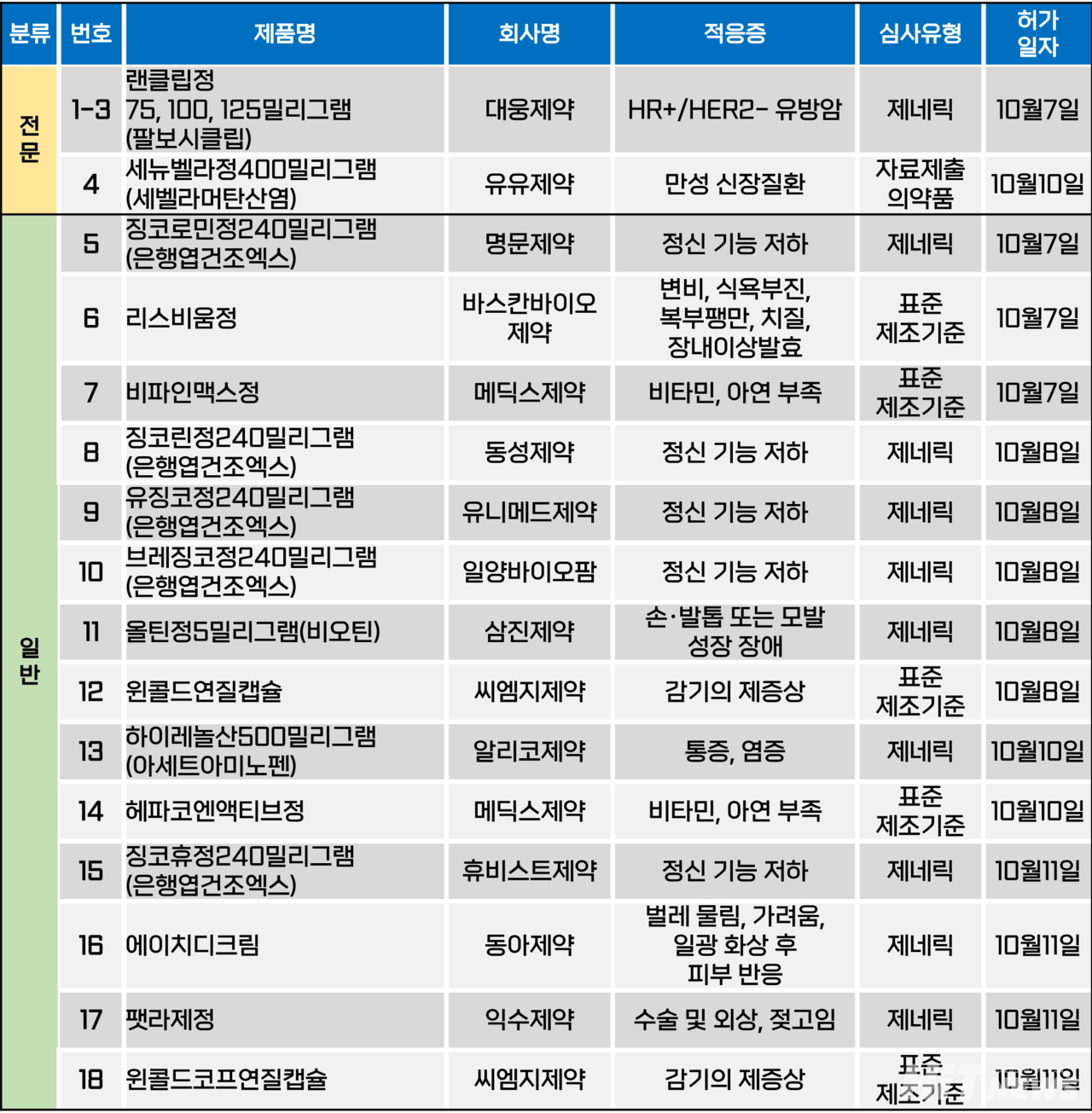 지난주(10월 7~11일) 총 18개 품목이 식품의약품안전처에서 품목허가를 받았다. 전문의약품은 4개, 일반의약품은 14개 품목이다. 이들은 유방암, 만성 신장질환, 정신 기능 저하 등 다양한 적응증으로 허가됐다.
