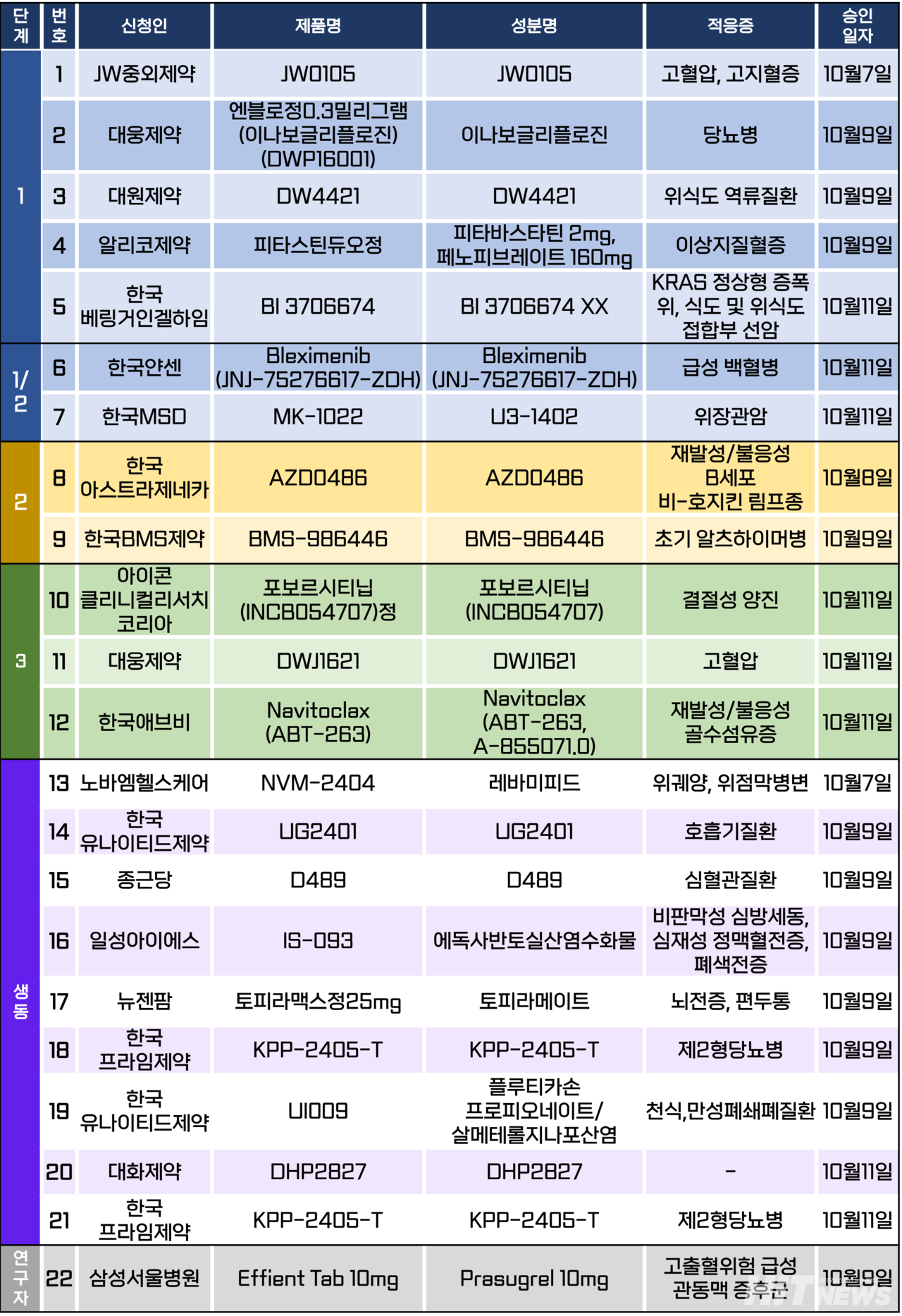 임상시험계획은 총 22건이 승인됐다. 세부적으로 △1상 5건 △1/2상 2건 △2상 2건 △3상 △생물학적 동등성 9 △연구자 임상 1건 등이다. 이 임상시험들은 고혈압, 고지혈증, 당뇨병, 알츠하이머병, 결절성 양진 등 질환과 백혈병, 위장관암, B세포 비호지킨 림프종 등 암종을 대상으로 승인됐다.