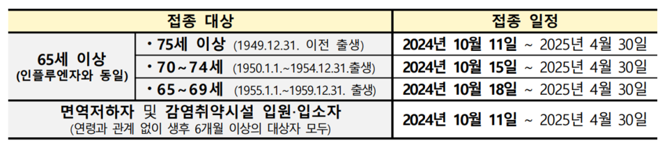 질병관리청(청장 지영미)은 지난 11일부터 65세 이상 어르신, 면역저하자 및 감염취약시설 입원‧입소자 대상 ’24-’25절기 코로나19 예방접종이 진행 중이라고 밝혔다.