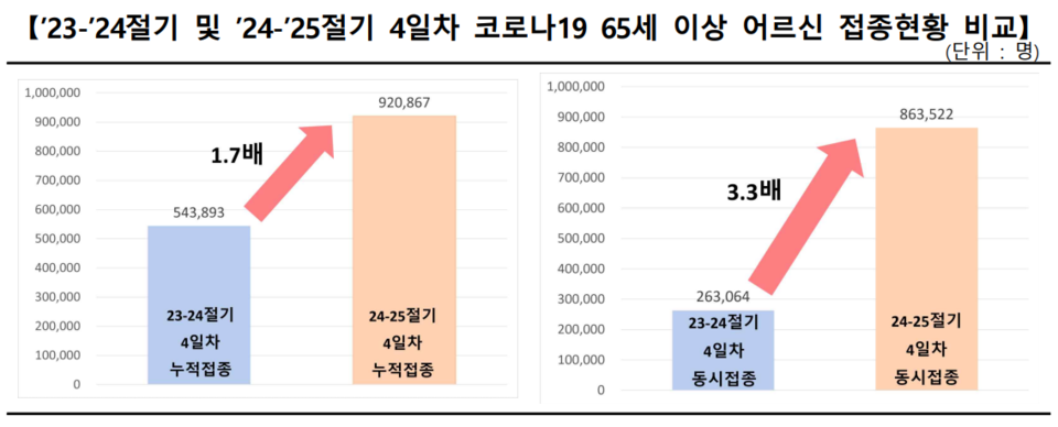 접종 4일 차인 10월 14일 18시 기준, 65세 이상 누적 접종자는 92만867명이며 누적 접종률은 8.9%로, 지난 ’23-’24절기 동기간 접종률(5.6%)의 약 1.7배에 달했다. 지난 ’23-’24절기 코로나19 예방접종 4일차 65세 이상 누적 접종자 수는 54만3893명이었다.