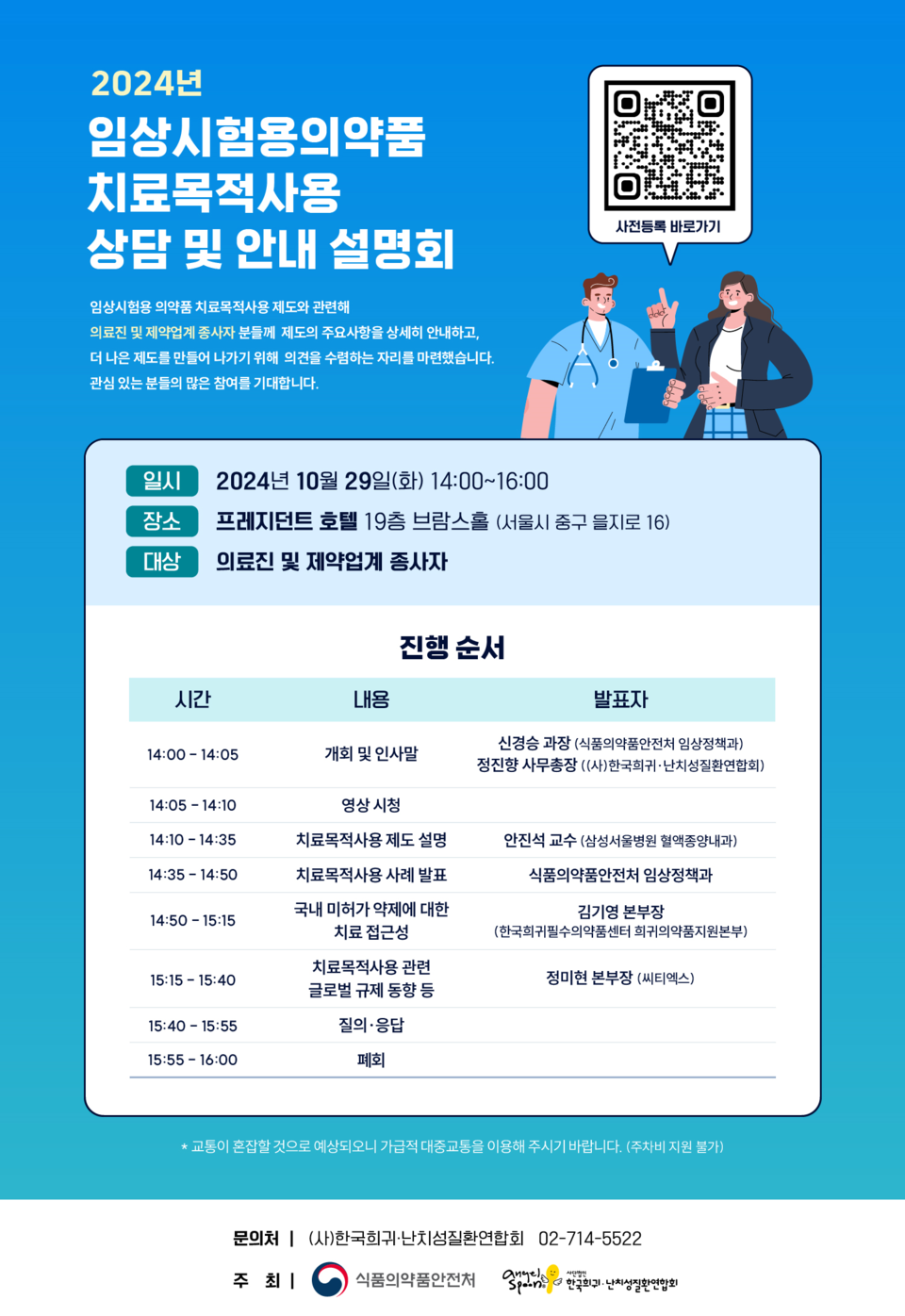 이번 설명회의 주요 내용은 ①치료목적사용 제도 절차 설명 및 실제 적용 사례 소개 ②국내 미허가 의약품에 대한 치료 접근성 ③치료목적사용 관련 글로벌 규제 동향 등이며, 참가를 원하는 분은 누구나 포스터 정보무늬(큐알코드)를 이용하여 사전등록할 수 있다.