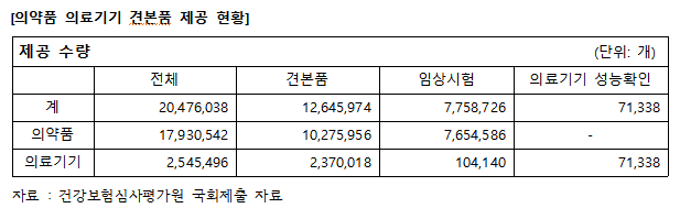의약품·의료기기 견본품 제공현황을 보면, 의약품 1793만 542개, 의료기기 254만 5496개가 견본품으로 제공된 것으로 나타났다. 임상시험을 위한 견본품으로 의약품 765만 4586개, 의료기기 10만 4140개가 제공됐으며, 의료기기의 경우 성능확인을 위해 7만 1,338개가 견본품으로 제공됐다.