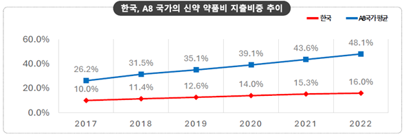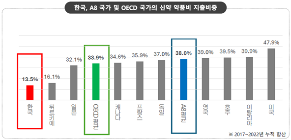 연구 결과 국내 총 약품비 대비 신약의 지출 비중은 13.5%로, A8 국가 평균인 38%와 OECD 국가 평균인 33.9%의 절반 이하 수준에 그쳤다. 특히 2017년부터 2022년까지 A8 국가 평균과 격차가 벌어져 2022년에는 3배 차이가 나는 것으로 분석됐다.