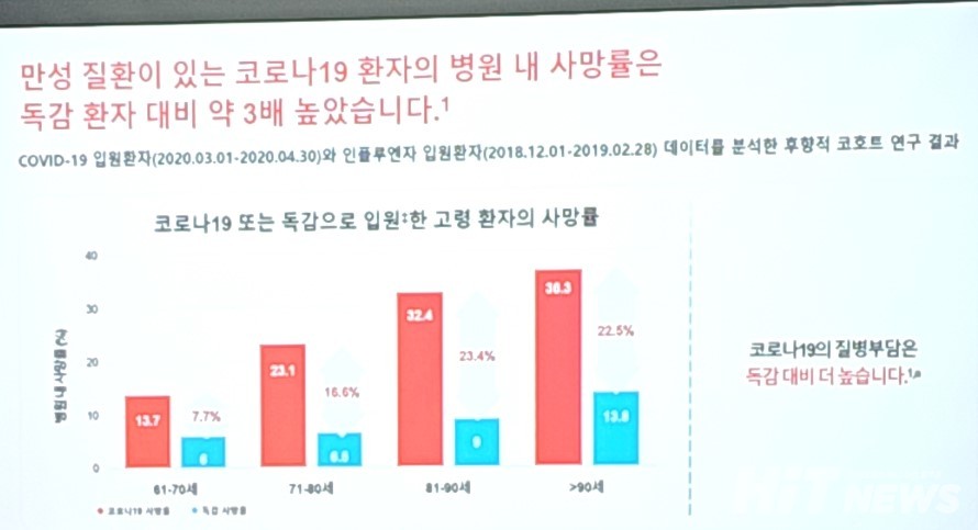 이재갑 교수는 "엔데믹으로 사람들은 독감과 코로나19를 동일한 급의 질환으로 치부하는 경향이 있는데, 고령 환자를 기준으로 코로나19로 인한 입원율은 독감 대비 약 4배 높았고, 병원 내 사망률은 약 3배 높았다"며 "고령 및 동반질환을 보유한 고위험군의 경우 독감이 가장 유행하는 1~2월에만 약 2000명 이상 돌아가신다. 연구 결과 코로나19의 질병 부담이 더 큰 것으로 나타났는데, 만약 코로나19와 독감이 함께 유행한다면 중증환자 발생과 사망 환자는 훨씬 더 많아질 수 있다"고 우려했다.