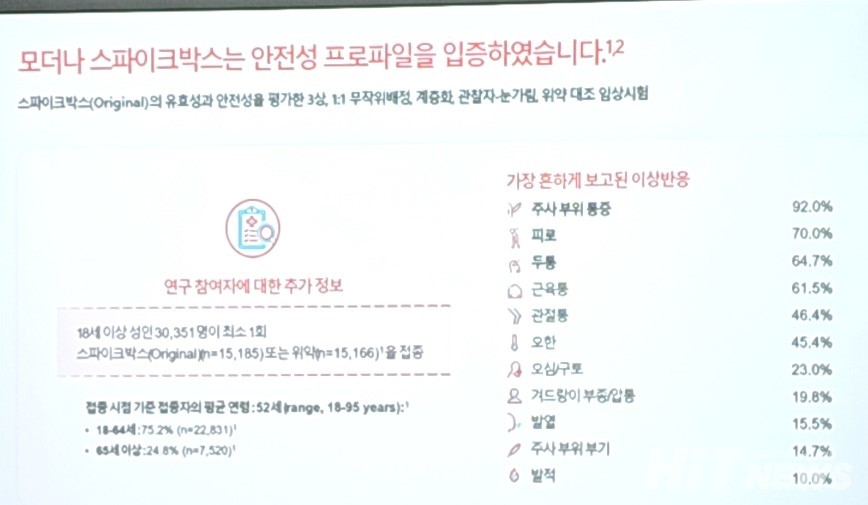 이 교수에 따르면, 모더나는 자사 mRNA 백신 '모더나스파이크박스'의 주요 3상 임상시험인 'COVE' 연구를 통해 예방 효과를 입증했다. 이 연구에서 스파이크박스는 전체 환자군에서 93.2%의 예방효과를 보였다. 가장 흔하게 보고된 이상반응은 △주사 부위 통증 △피로 △두통 △근육통 등이었다.