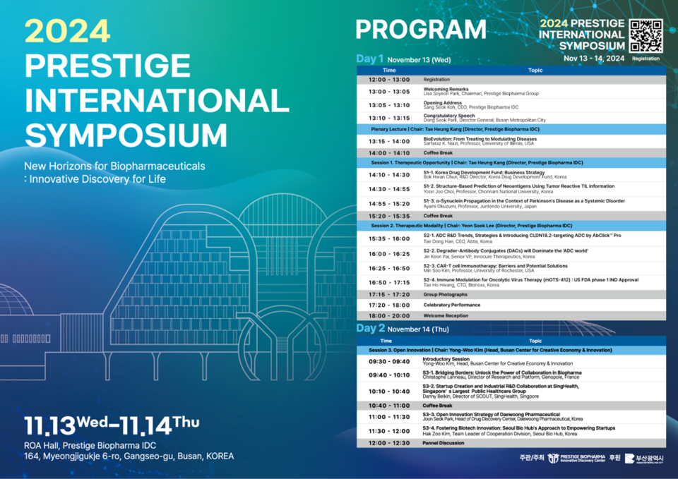 프레스티지바이오파마(대표 박소연)의 R&D 컨트롤타워 프레스티지바이오파마IDC(대표 고상석, IDC)는 신규 사옥을 완공하고, 첫 번째 국제 심포지엄을 개최한다고 25일 밝혔다. 행사는 본사 1층 ROA홀에서 내달 13일과 14일 양일에 걸쳐 진행되며 부산광역시가 후원한다.