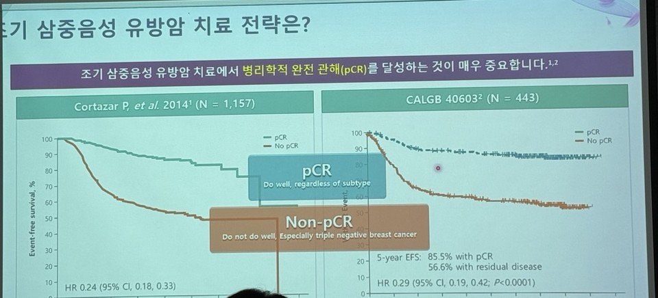 임 교수는 "선행 보조화학요법을 사용하고 수술에서 떼어낸 조직에 암세포가 있는지에 따라 완전관해(CR) 여부가 정해지는데, 조기 삼중음성유방암 치료는 CR에 도달하는 것이 전반적인 부분을 좌우한다"고 설명했다.