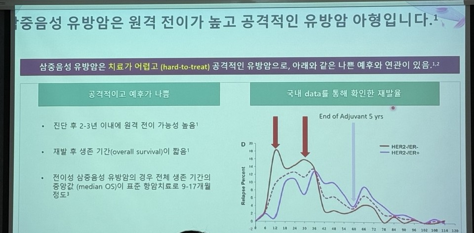 또한 HR+암과 HER2+암의 5년 생존율은 90~95%인 반면, 삼중음성유방암의 5년 생존율은 76.9%로, 10명의 환자 중 1명 정도만 5년 생존이 가능하다. 따라서 조기에 암세포를 많이 박멸할수록 환자의 생존 기간이 늘어난다는 게 임 교수의 설명이다.
