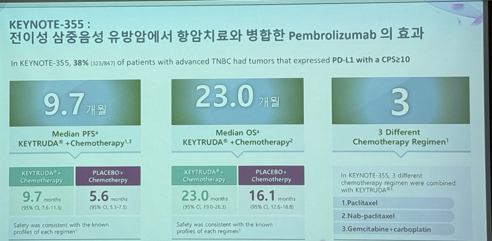 'KEYNOTE-355' 연구에서 △탁센 △젬사이타빈 △카보플라틴 등의 항암제에 키트루다를 추가한 것을 퍼스트 라인으로 진행했을 때 PDL-1이 CPS 10 이상인 경우 무진행 생존율(PFS)이 기존 5.6개월에서 9.7개월로 연장됐다. 아울러 OS가 16개월에서 23개월로 늘어났다.