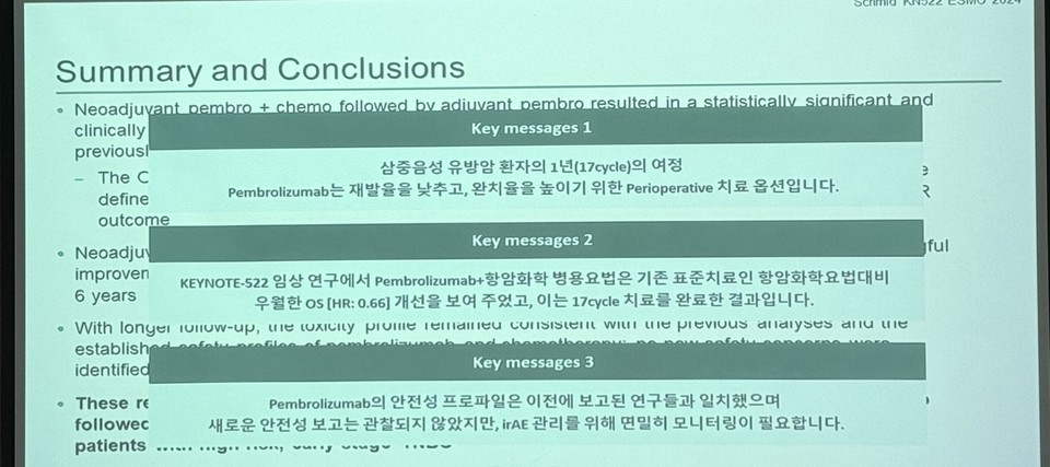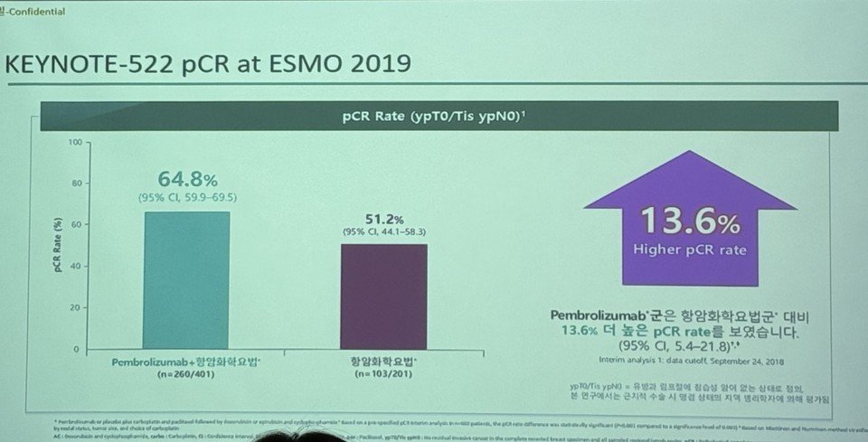 그러면서 "지난 30년간 수술 전 화학요법에서 pCR을 높이고, OS를 연장시키면서 뉴잉글랜드 의학 저널(NEJM)에 게재된 약은 없다. 선행화학요법의 수술과 수술보조요법은 조기 삼중음성유방암의 치료에서 전반적인 면역 체계를 리셋하기에 굉장히 중요하다"고 밝혔다.