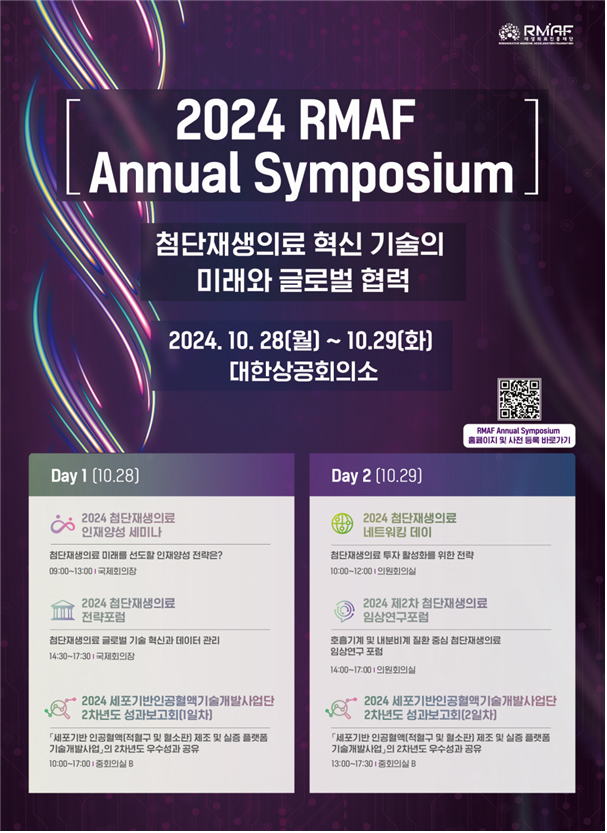 세보건복지부(장관 조규홍)와 재생의료진흥재단(원장 박소라)은 28일과 29일 양일간 대한상공회의소에서 ‘첨단재생의료 혁신 기술의 미래와 글로벌 협력’을 주제로 첨단재생의료 통합 심포지엄(2024 RMAF Annual Symposium)을 개최한다고 밝혔다.