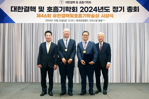 유한양행(대표이사 조욱제)과 대한결핵 및 호흡기학회(회장 박재용)는 지난 25일 서울 잠실 롯데호텔월드 크리스탈 볼룸에서 열린 '대한결핵 및 호흡기학회 2024년도 정기총회'에서 시상식을 열고 심재정 고려대학교구로병원 호흡기·알레르기내과 교수와 유철규 중앙대학교병원 호흡기알레르기내과 교수에게 제46회 유한 결핵 및 호흡기 학술상을 수여했다고 29일 밝혔다.