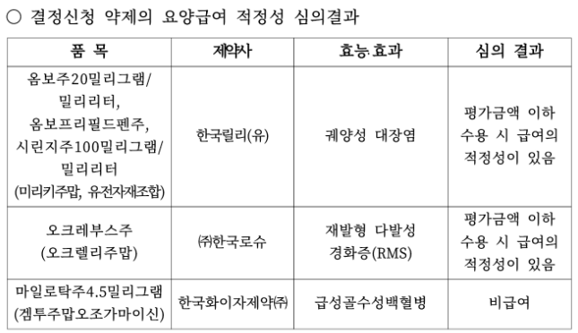한국릴리의 '옴보주20㎎(성분 미리키주맙)' 등과 한국로슈의 '오크레부스주(성분 오크렐리주맙)'는 모두 평가금액 이하 수용 시 급여의 적정성이 있다고 결정됐다. 두 약제는 각각 '궤양성 대장염'과 '재발형 다발성 경화증(RMS)' 치료제다.