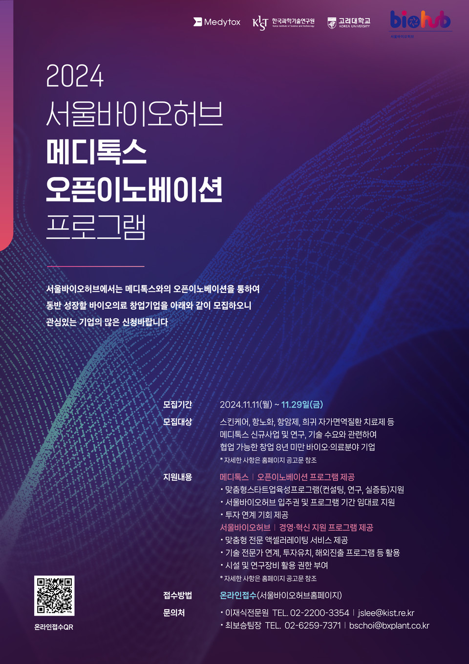 메디톡스(대표 정현호)는 국내 바이오 산업 발전과 개방형 혁신 생태계 구축을 위해 '2024 서울바이오허브-메디톡스 오픈이노베이션 프로그램' 참여 기업을 모집한다고 12일 밝혔다.