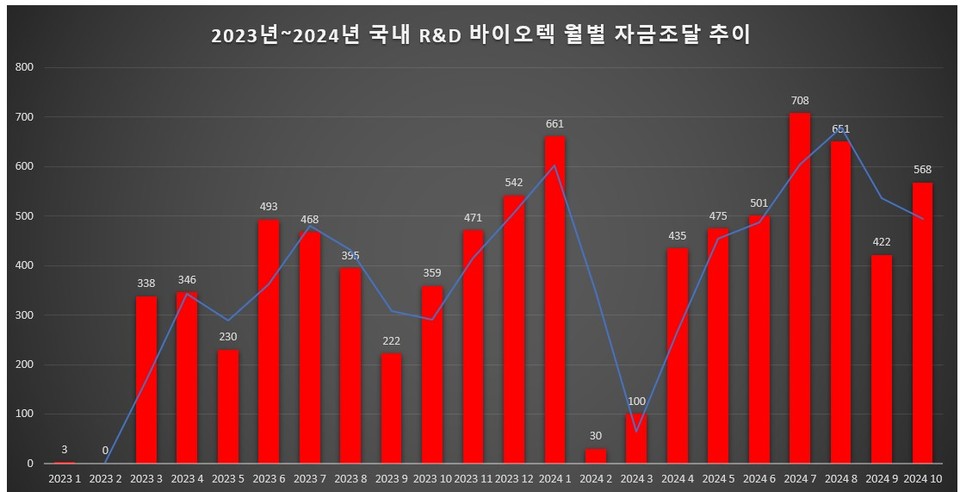 월별 기준 신약 개발 바이오 벤처 펀딩 규모가 500억원을 넘긴 것은 올해 들어 네 번째입니다. 신약 바이오텍들은 올해 6월부터 줄곧 월별 500억원대 투자금을 유치해 왔습니다. 9월 추석연휴 영향에 따라 투자 집행 실적이 422억원으로 내려앉았지만, 10월 다시 500억원 고지를 회복했습니다.