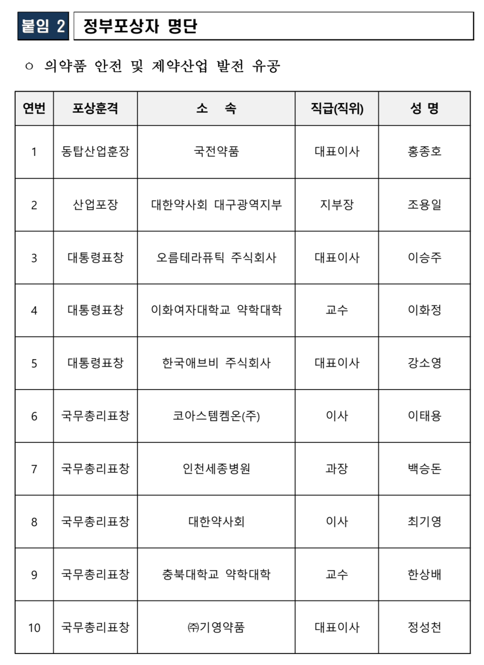 이번 기념식에서는 원료의약품 국산화 및 자립화를 통해 국내 공급 안정화에 기여한 공로로 홍종호 국전약품 대표이사에게 동탑산업훈장, 주민 건강과 의약품 복용 지도 등 지역사회 발전에 헌신한 조용일 대한약사회 대구광역지부 지부장에게 산업포장 등 의약품 안전과 제약산업 발전에 이바지한 유공자에게 총 41점의 훈·포장과 표창을 수여한다.