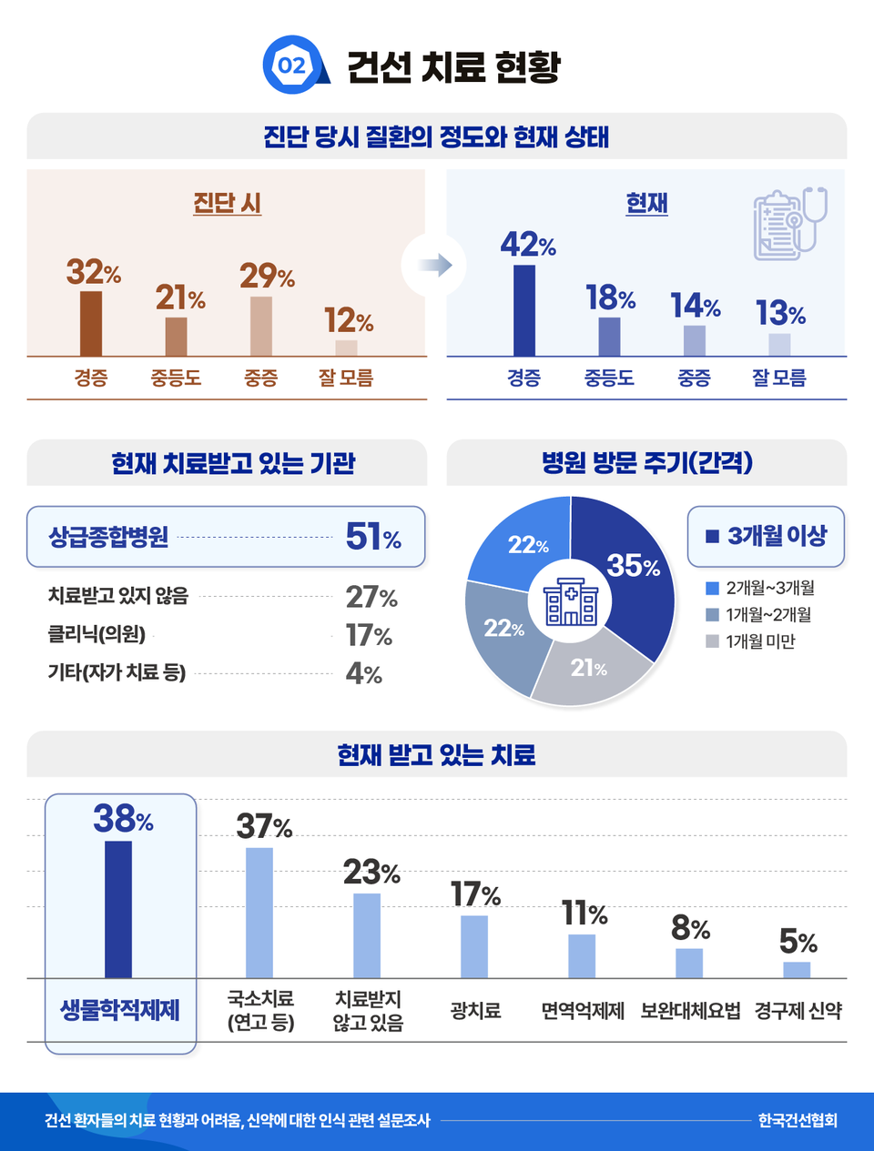 조사 결과, 응답자의 약 70%가 전문의 진료를 받고 있는 것으로 나타났다. 현재 치료 기관을 묻는 질문에서 51%의 환자가 상급종합병원에서 치료받고 있다고 응답했으며, 17%는 클리닉(의원)에서 치료받고 있는 것으로 나타났다. 하지만 여전히 27%의 환자는 치료받지 않고 있었으며, 4%는 자가치료를 하는 등 병원을 찾지 않는 환자도 약 30%에 달하는 것으로 나타났다.