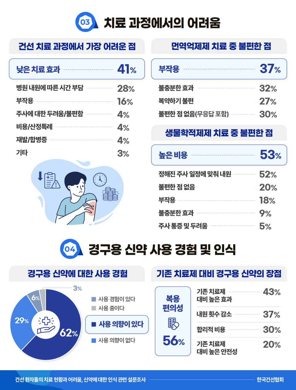 건선 치료 과정에서 환자들이 느끼는 가장 큰 어려움은 낮은 치료 효과(41%)였다. 또한 병원 내원에 따른 시간 부담(28%)이나 부작용(16%)과 더불어 주사에 대한 두려움/불편함(4%), 비용/산정특례(4%), 재발/합병증(4%) 등 여러 어려움을 겪고 있는 것으로 조사됐다.