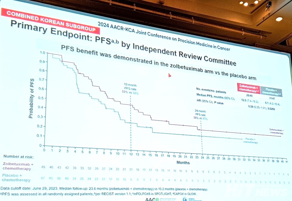 이번 한국인 하위분석(빌로이 병용군 49명 vs 위약 병용군 47명) 결과, PFS와 OS 중앙값 모두 전체 환자군 데이터에 비해 눈에 띄는 개선을 보였다.