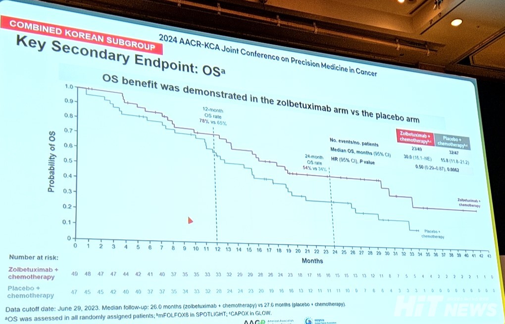 아스텔라스가 개발한 클라우딘 18.2(Claudin 18.2) 타깃 치료제 '빌로이(성분 졸베툭시맙)'가 HER2 음성 위·위식도 접합부 선암 1차 치료를 평가한 3상 임상시험의 한국인 하위 분석에서 전체 환자군 대비 2배에 가까운 전체 생존기간(OS)을 기록했다.