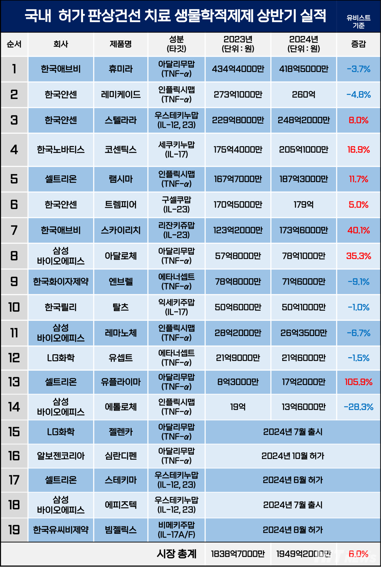 건선 적응증 생물학적제제, 상반기 매출 1949억원…전년비 6% 성장