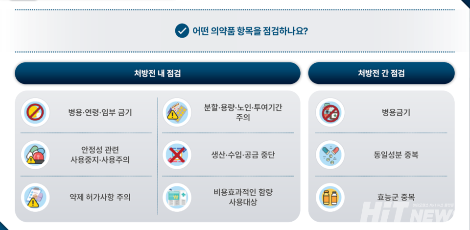 DUR의 점검 항목은 △병용·연령·임부 금기 △분할·용량·노인·투여 기간 주의 △약제 허가사항 주의 등 처방전 내 내용과 △병용금기 △동일 성분 중복 △효능군 중복 등 처방전 간 내용이다.
