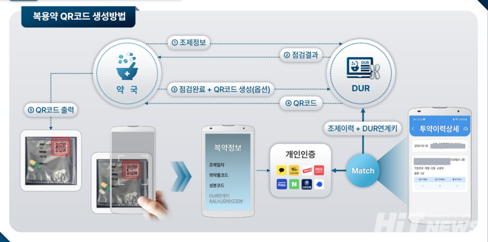 약사가 조제 정보를 DUR 시스템에 입력하면 점검 후 QR코드가 생성되고, 약포지에 있는 QR코드를 환자가 카메라에 인식하면 개인인증을 진행한 뒤에 복약 정보와 투약 상세 이력을 확인할 수 있다.