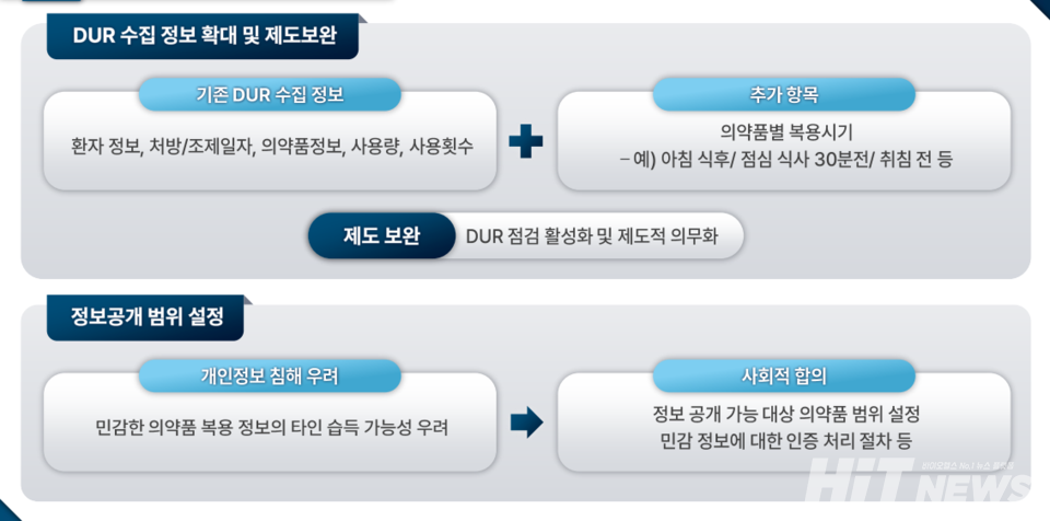 심평원은 기존 DUR 수집 정보인 △환자 정보 △처방/조제 일자 △의약품 정보 △사용량 △사용횟수 등에 더해 의약품별 복용 시기(아침 식후, 점심 식사 30분 전 등) 정보를 추가로 수집이 필요하다고 주장했다.