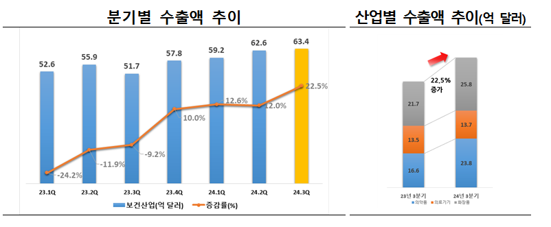 보산진 이병관 바이오헬스혁신기획단장은 "2024년 3/4분기 보건산업 수출은 상반기에 이어 화장품과 의약품에서 역대 분기 최대 실적을 달성하면서 보건산업 수출 증가를 주도했다"며 "4/4분기에도 바이오의약품과 기초화장용 제품류 등 주력 품목의 수요지속으로 보건산업 수출의 증가 폭은 더욱 커질 것으로 예상된다"고 밝혔다.