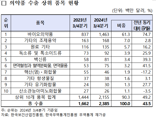 바이오의약품과 백신류 수출 증가에 힘입어 올해 3/4분기 의약품 수출은 전년 동기 대비 43.5% 증가한 23억8000만 달러를 기록한 것으로 집계됐다. 특히 바이오의약품 수출액 증가율은 74.7%로 역대 분기 최고 실적을 보였다.