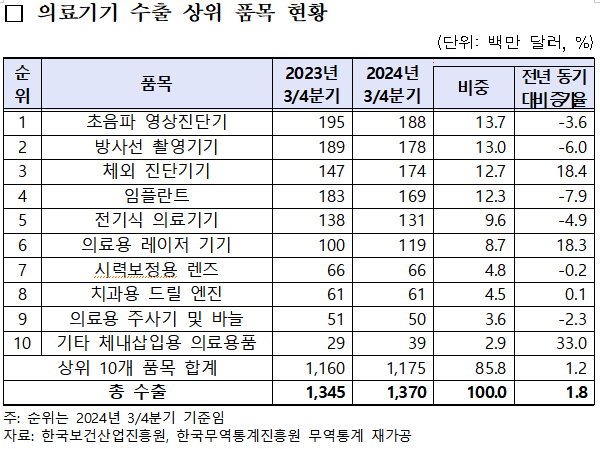 체외 진단기기는 전체 의료기기 수출의 약 12.7% 차지를 차지하고 있으며 일본(+274.1%)과 호주(+101.6%)에서 수출이 증가했고, 의료용 레이저 기기는 미국(+44.9%)과 태국(+267.3%)을 대상으로 수출액이 늘었다. 반면, 수출 주력품목인 '임플란트'와 '방사선 촬영기기' 수출이 전년 동기 대비 5% 이상 감소한 것으로 나타났다.