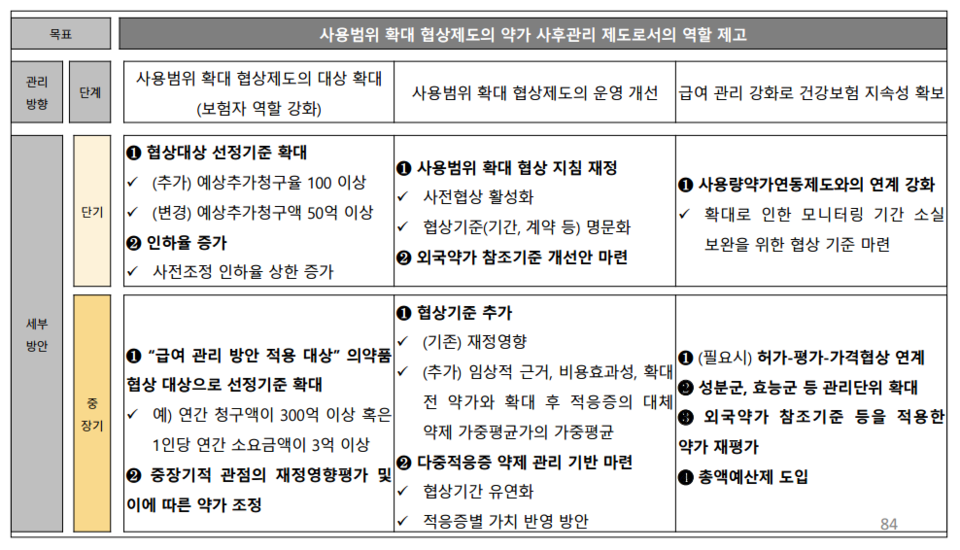 ① 협상대상 약제 선정기준 조정 = 연구에서는 치료효과, 비용효과성, 재정영향 등의 불확실성이 있는 의약품 중 연간 청구액이 300억 이상 혹은 1인당 연간 소요액이 3억 이상인 약제인 '급여관리 방안 적용 대상'의약품까지 협상 대상을 확대하는 것을 제안했다.