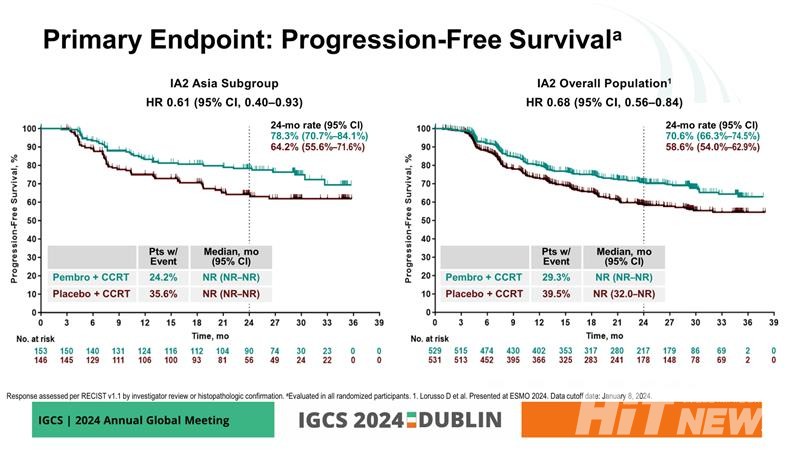 ESMO 2023에서는 PFS 데이터의 통계적 유의성을 입증했다. 중앙 추적관찰 17.9개월 시점 PFS는 키트루다+CCRT군과 위약+CCRT군 모두 중앙값에 이르진 못했지만, 24개월 추정 PFS 비율이 키트루다 병용군이 67.8%, 위약군 57.3% 대비 질병 진행 또는 사망의 위험을 30% 낮춘 것으로 나타났다(HR=0.70, 95% CI : 0.55-0.89, P=0.002).