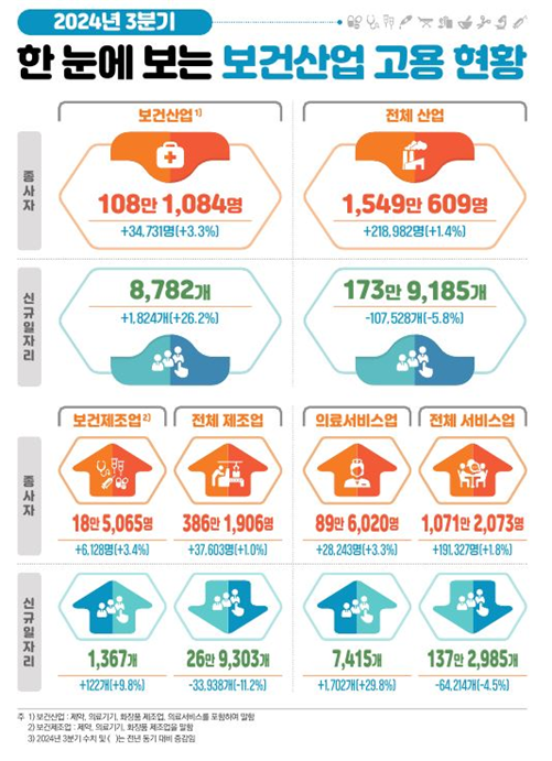 한국보건산업진흥원(원장 차순도)은 9일 2024년 3/4분기 보건산업 고용동향을 발표했다.