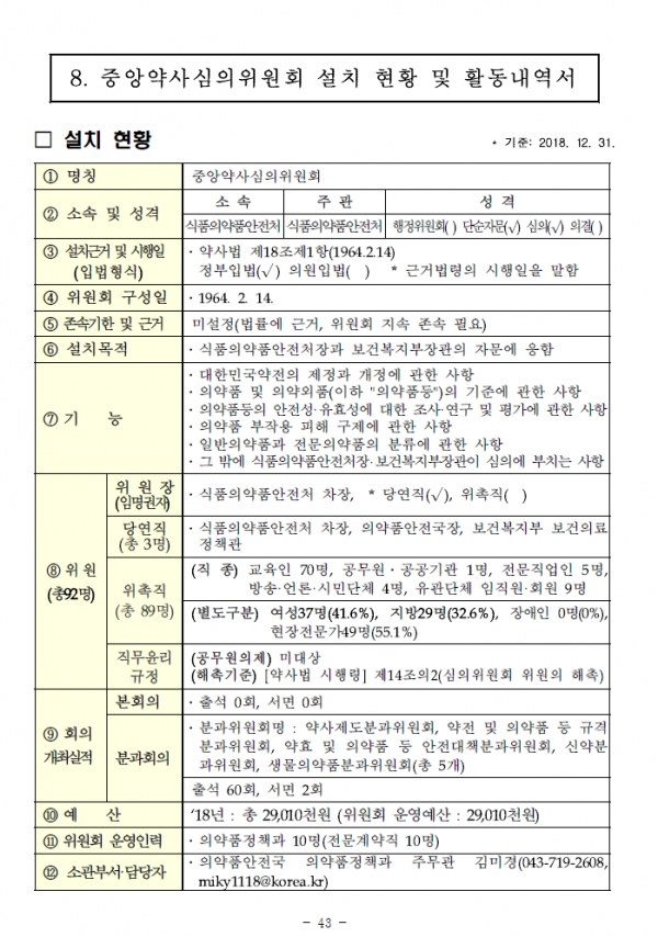 지난 27일 식약처가 공개한 중앙약사심의위원회 설치현황 및 활동내역서에 따르면 총 92명의 위원들이 약사제도분과위, 약전 및 의약품 등 규격분과위, 약효 및 의약품 등 안전대책분과위, 신약분과위, 생물의약품분과위 등 5개의 분과로 나눠 회의를 열었다.