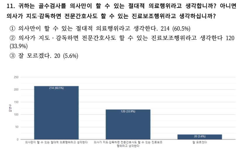골수검사를 의사만이 할 수 있는 절대적 의료행위라고 생각하는지 의사가 지도·감독하면 전문간호사도 할 수 있는 진료보조행위라고 생각하는지 질문에 절대적 의료행위라고 응답한 환자는 354명 중 214명(60.5%)이었고 진료보조행위라고 생각한 환자는 120명(33.9%)이었다.