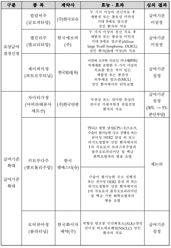 반면, 한국화이자제약의 비소세포폐암 치료제 '로비큐아(성분 롤라티닙)'는 급여기준 확대에 성공했다. '역형성 림프종 인산화효소(ALK)-양성 전이성 비소세포폐암 성인 환자의 치료'에서다. 또, 한국얀센의 '자이티가정(성분 아비라테론아세트산)'의 급여 확대 기준과 한국릴리의 '제이퍼카정(성분 퍼토브루티닙)'의 급여기준이 설정됐다.
