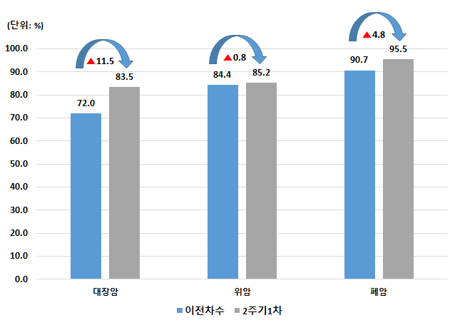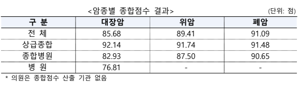 종합점수는 폐암(91.09점), 위암(89.41점), 대장암(85.68점) 순으로 높았으며, 상급종합병원의 점수가 다른 종별에 비해 높게 나타났다.