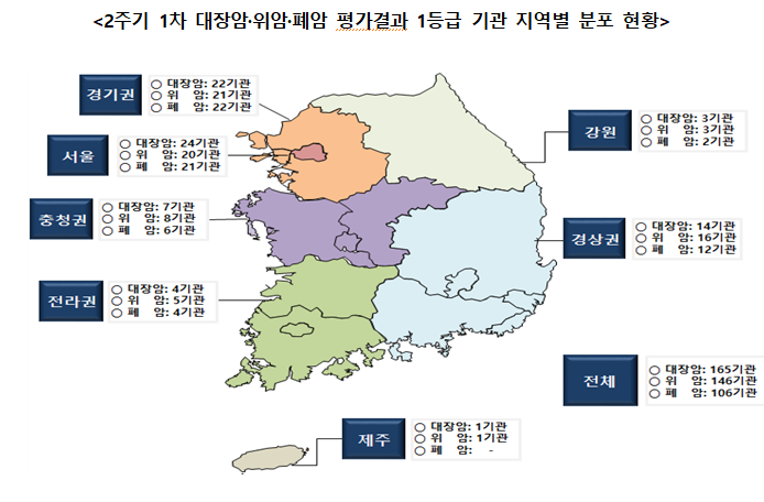 평가결과, 1등급 기관 비율은 폐암 80.7%, 위암 74%, 대장암 56.4%이고, 대장암과 위암은 전국 모든 권역에 1등급 기관이 분포하지만 제주 지역에는 폐암 1등급 기관이 없는 것으로 확인됐다.