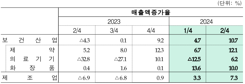 올해 2분기 제약업계와 의료기기업계의 매출액 증가율은 12.1%·6.2%로, 직전 분기 대비 각각 5.4%p·18.7%p 상승했다.