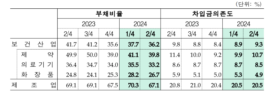 매출 증가율과 매출액영업이익률이 모두 증가함에 따라 제약업계의 부채비율은 41.1%에서 39.8%로, 의료기기업계의 부채비율은 35.5%에서 33.2%로 부채비율이 모두 완화됐다.
