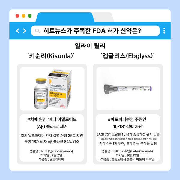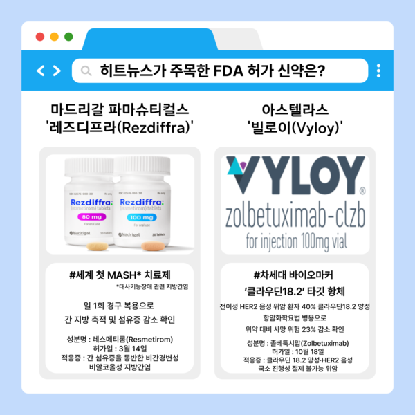 이 외에도 마드리갈 파마슈티컬스가 세계 최초로 개발한 대사이상 관련 지방간염(MASH) 치료제 '레즈디프라(성분 레스메티롬)', 일라이 릴리가 개발한 치매 치료제 '키순라(성분 도나네맙)'와 아토피피부염 치료제 '엡글리스(성분 레브리키주맙)', 아스텔라스가 개발한 클라우딘18.2 양성ㆍHER2 음성 위암 치료제 '빌로이(성분 졸베툭시맙)' 등이 주요 제품으로 허가됐다.
