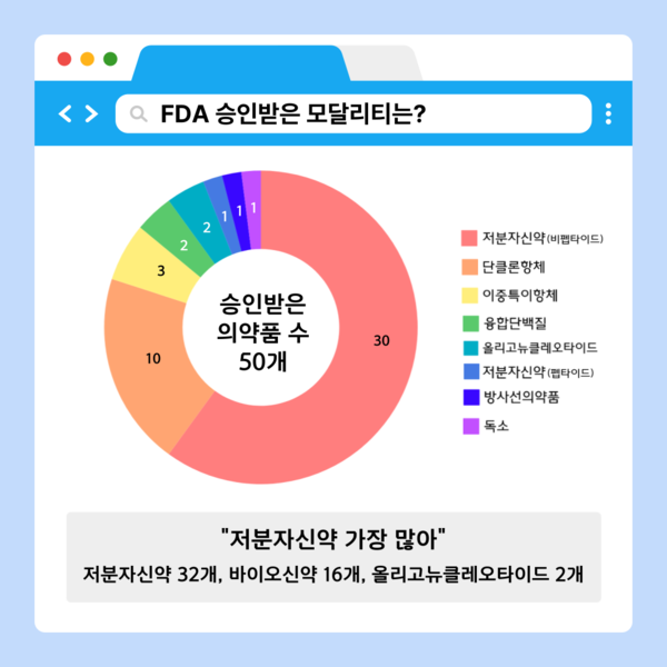 가장 많은 비율을 차지한 저분자신약은 비펩타이드 제제가 30개, 펩타이드 제제가 1개, 방사성의약품이 1개 허가됐으며, 바이오신약에는 단일클론항체 10개, 이중특이항체 3개, 융합단백질 2개, 독소 1개 등이 포함됐다.