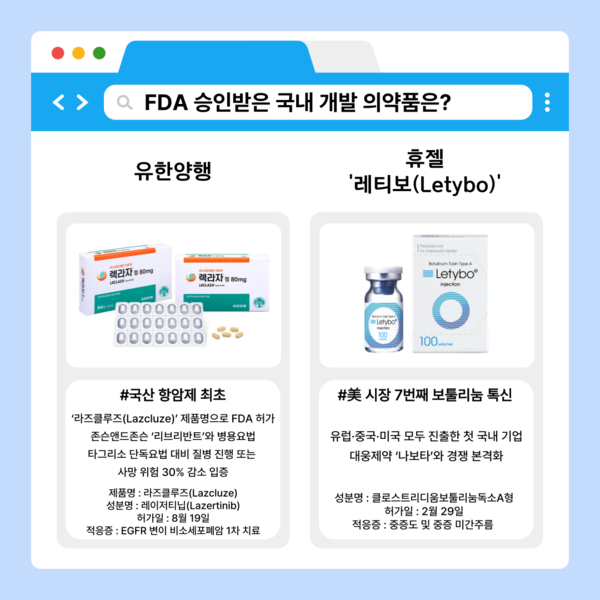 50개 제품 중 국내 개발 제품은 2개가 포함됐다. 유한양행이 개발한 3세대 EGFR 변이 비소세포폐암 치료제 '렉라자(성분 레이저티닙)'과 휴젤이 개발한 미간주름 개선 보툴리눔 톡신 제제 '레티보(성분 클로스트리디움 보툴리눔독소A형)'이 그 주인공이다.