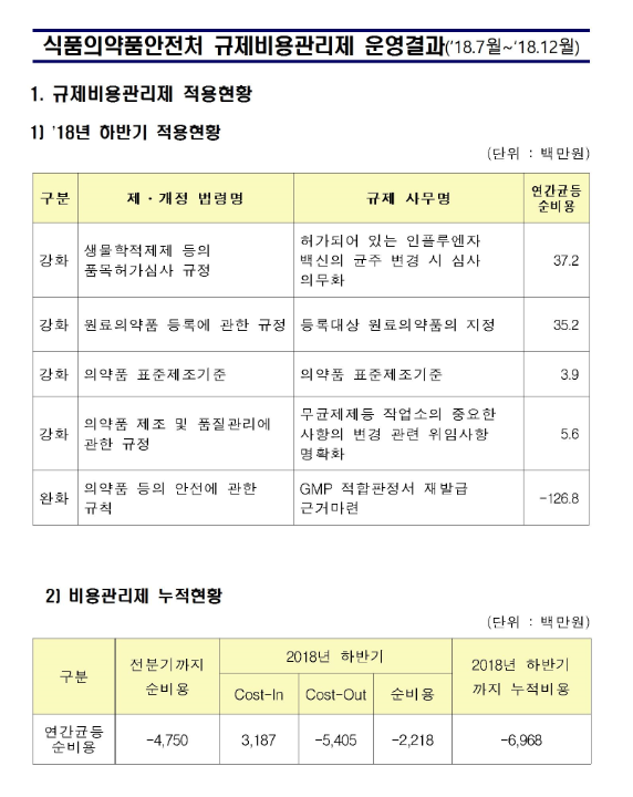 한편, 식품의약품안전처는 비용관리제 누적현황을 명시했는데 2018년 하반기까지 누적된 식품·의료제품의 모든 연간균등순비용은 '-69억6800만원'으로 피규제자가 69억6800만원의 비용이 경감됐다고 덧붙였다.