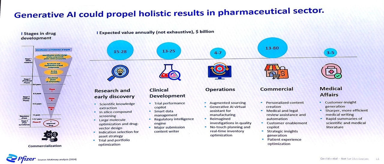 오 대표는 "생산 과정에서도 사람들이 매뉴얼로 하던 품질관리(QC), 공정관리(PM), 수율 최적화 등에 미치는 영향 등을 예측해 최상의 배치(Batch)를 만들기 위한 다양한 보완 활동까지, 생성형AI가 이를 가능하게 한다"며 "화이자는 이를 통해 저분자 의약품도 아닌 생물학적 제제인 백신을 한 해에 13억 도즈를 생산해 공급했다. 모든 사람이 불가능하다고 하는 것을 화이자는 혁신을 통해 가능토록 한 것"이라고 강조했다.