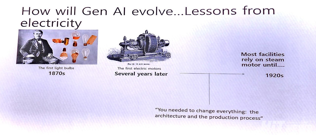 그는 "생성형AI는 이 모든 과정을 고도로 훈련된 재직자들이 오랜 시간에 걸쳐 수행하던 것보다 더 빠르고, 품질을 담보하면서 결과를 만들어낼 수 있다"며 "생성형AI는 밥도 안먹고, 잠도 안자고, 월급도 안받는다. 전기만 주면, 365일 열심히 프로그램을 돌려서 인간보다 몇 십 배, 몇 백 배 이상 빠른 속도로 결과를 완벽하게 만들어낸다"고 표현했다.