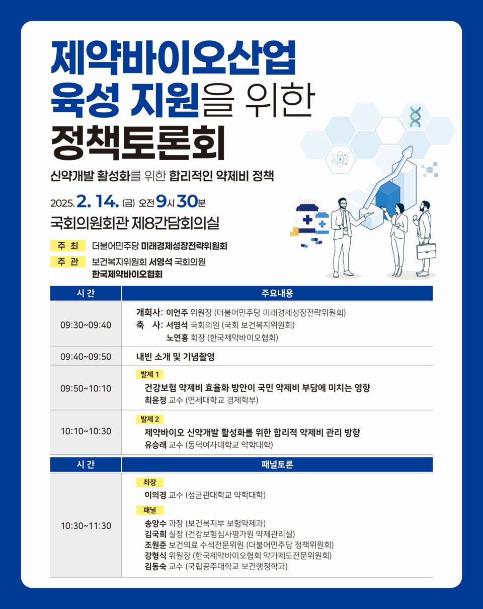 발제자로는 최윤정 연세대학교 경제학부 교수와 유승래 동덕여대 약학대학 교수가 나선다. 최 교수는 '건강보험 약제비 효율화 방안이 국민 약제비 부담에 미치는 영향'을 주제로 발제하며, 유 교수는 '제약바이오 신약개발 활성화를 위한 합리적 약제비 관리 방향'을 주제로 발표할 예정이다.